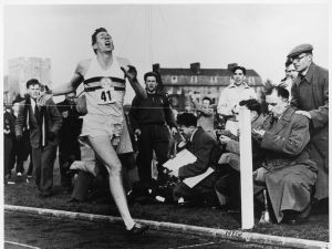 And then in 1954, the impossible was no longer impossible. Bannister ran the first ever sub four-minute mile. And in completely the wrong conditions, according to the experts. It was a cold day, on a wet track, in front of a few thousand people. He ran three minutes fifty-nine and four tenths of a second.